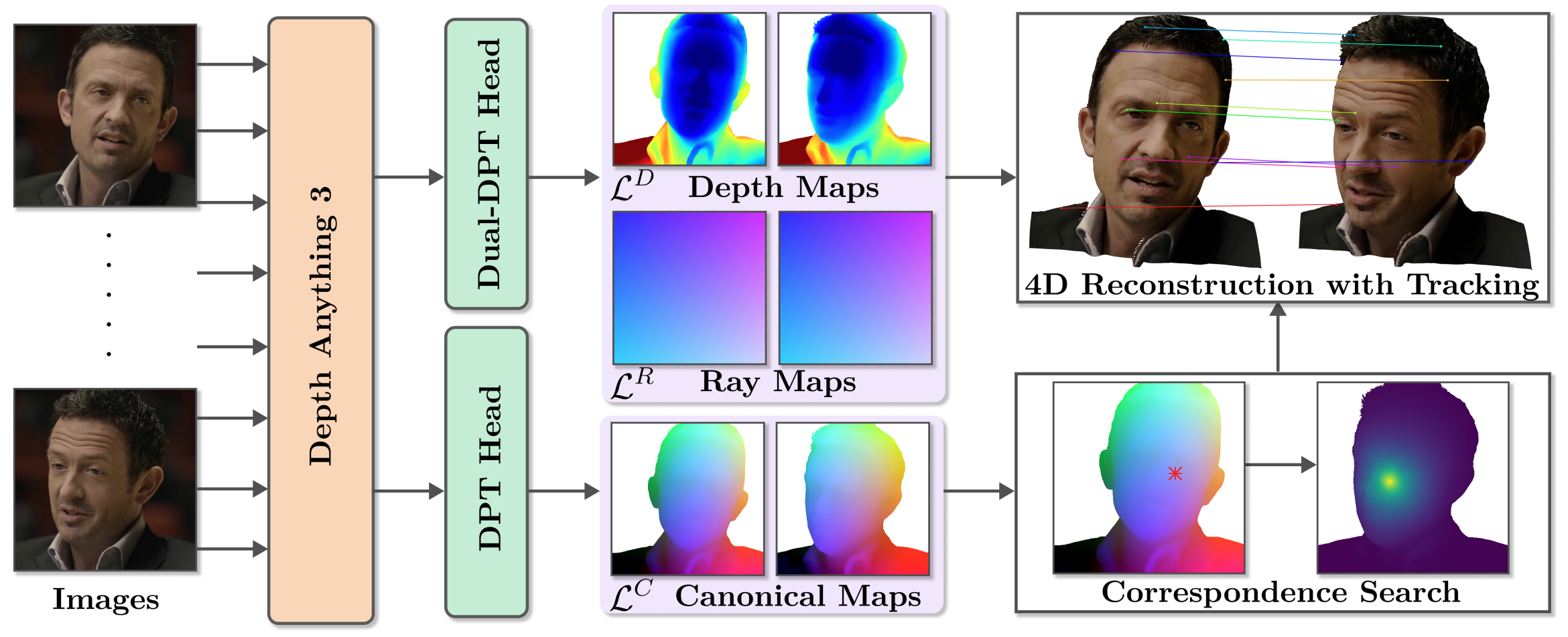 1. We propose a transformer-based architecture that jointly predicts depth, ray maps, and canonical facial maps from one or more input images.