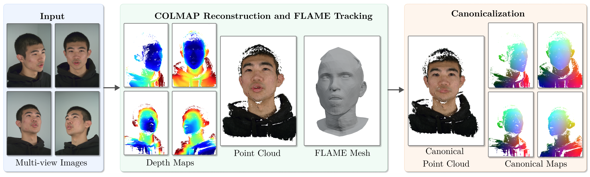 4. We perform FLAME-based tracking to align reconstructed geometry into a shared canonical space across frames and identities.